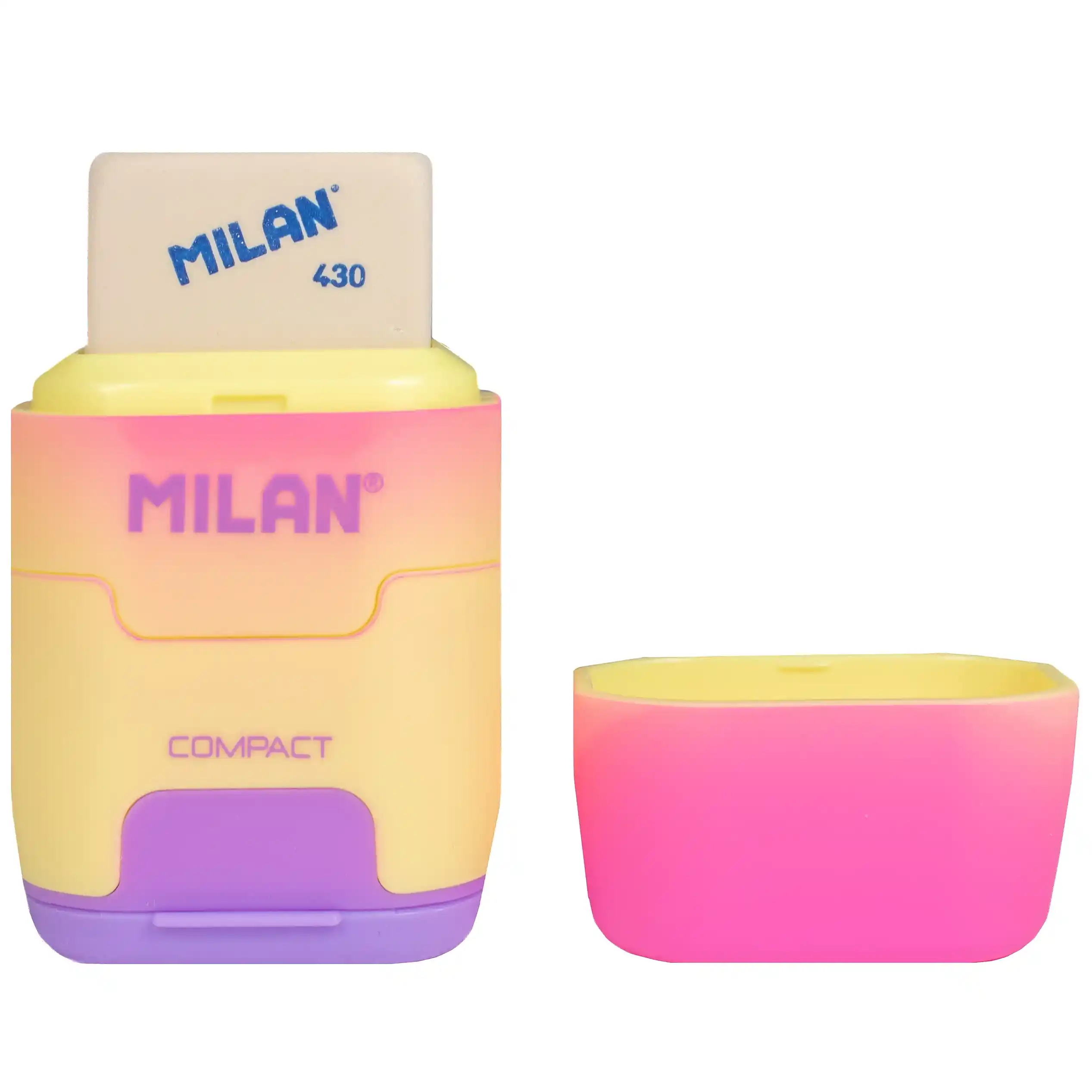 The flip open base reveals a dual hole pencil sharpener, with one standard hole and one wider hole to suit different pencil sizes. The top section includes a Milan 430 eraser, designed for clean and effective removal of pencil marks without damaging paper.
