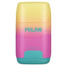The bottom section flips open to reveal a dual hole pencil sharpener, with one standard size hole and one wider hole to suit different pencil types. The top section contains a Milan 430 eraser, known for its reliable performance when removing pencil marks cleanly and neatly.