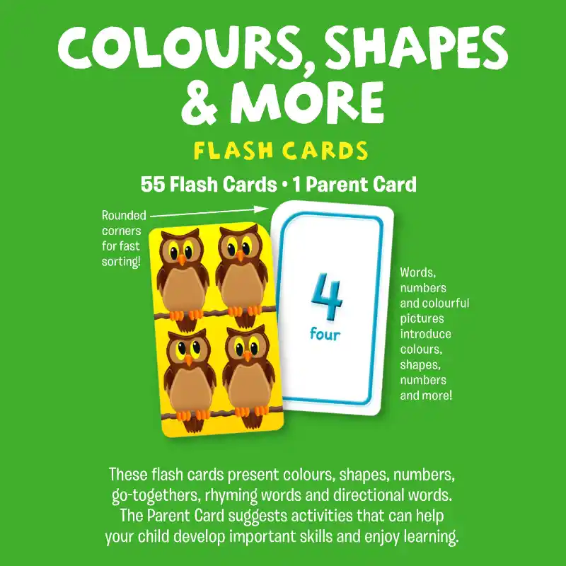 The 55 card set is grouped into six learning activities covering colours, numbers, shapes, directions, rhyming words and go together objects. A parent guide is included with activity ideas to support learning at home or in early learning settings.