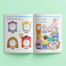 Lessons focus on understanding and comparing numbers up to 20, recognising basic geometric shapes, telling the time to the hour, counting money, identifying and extending patterns, and understanding the fraction concept of a half. Clear instructions, step by step examples and colourful illustrations help children practise with confidence.