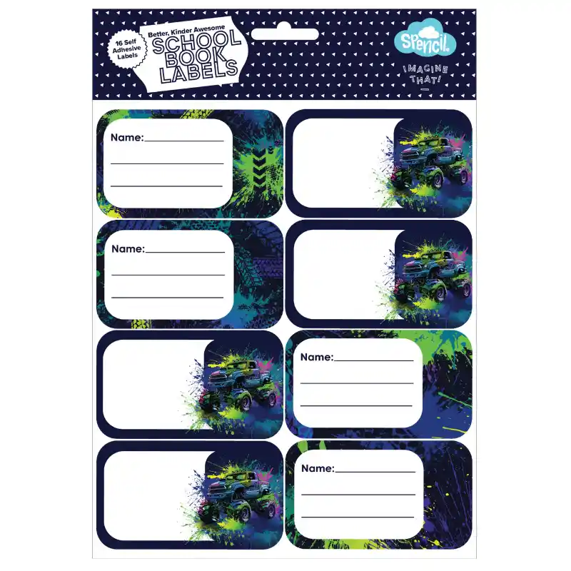 Keep school books easy to identify with the Spencil Book Labels 16 Pack in the Mega Wheels design. Featuring bold, vehicle-inspired artwork, these labels add a fun edge while helping prevent mix-ups at school.