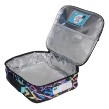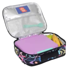 An aluminium food safe insulated lining helps maintain temperature, while multiple pockets make lunch packing simple and organised. The front zip pocket is perfect for extra snacks, the inside pocket is ideal for notes, and a two compartment mesh pocket inside the lid provides additional storage. A dual zip main compartment and thick padded handle make it easy for kids to open and carry.